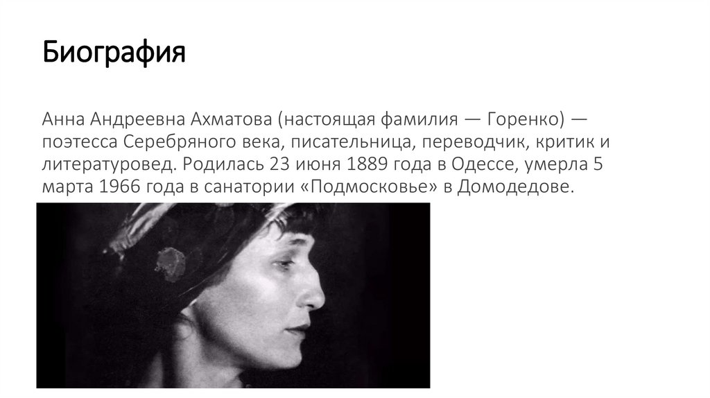 БиографияАнна Андреевна Ахматова (настоящая фамилия — Горенко) —