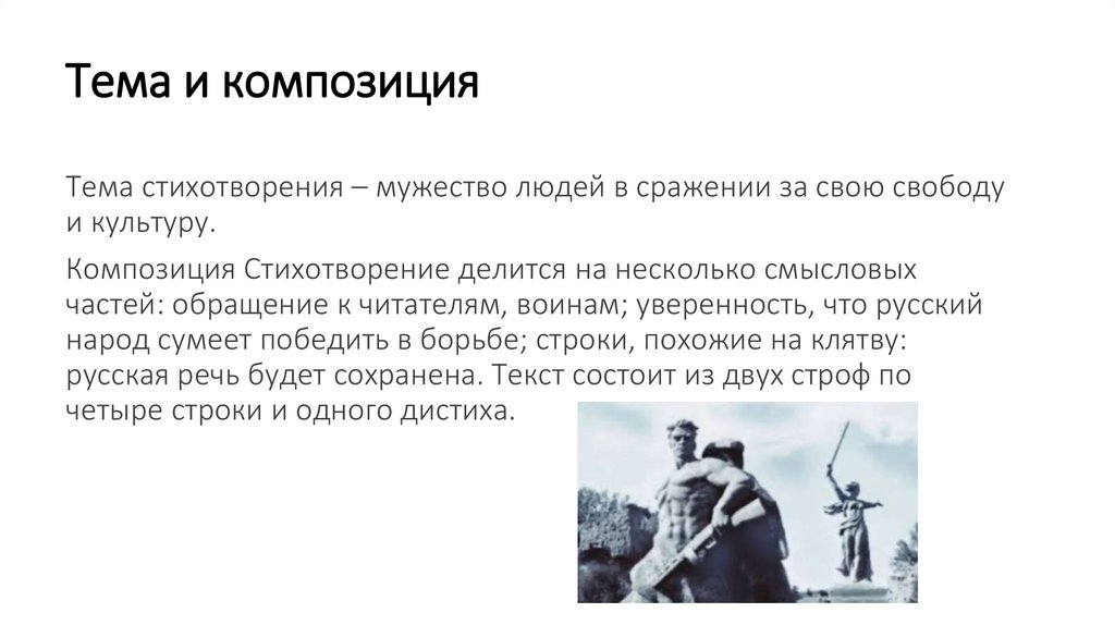 Тема и композицияТема стихотворения – мужество людей в сражении за свою свободу