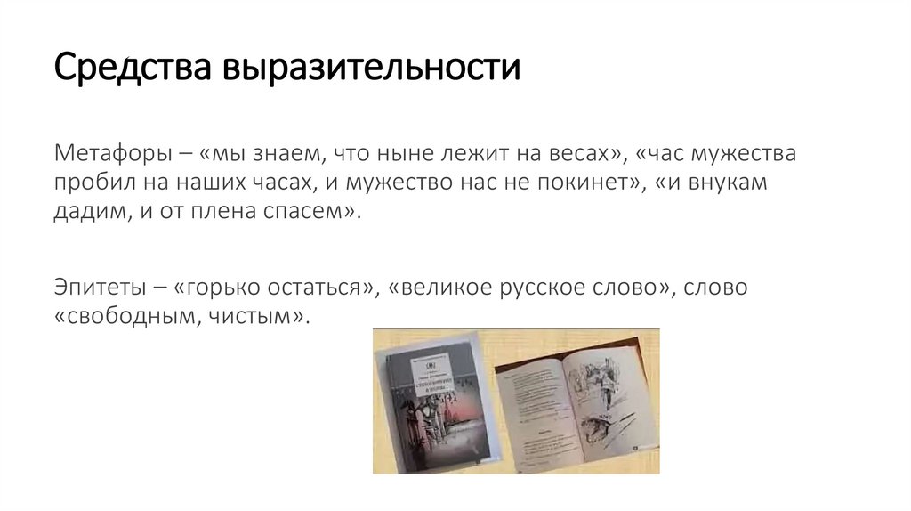 Средства выразительностиМетафоры – «мы знаем, что ныне лежит на весах», «час мужества