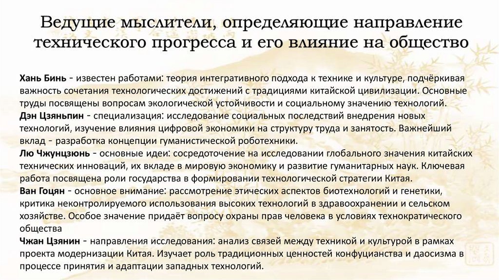 Хань Бинь - известен работами: теория интегративного подхода к технике и культуре, подчёркивая