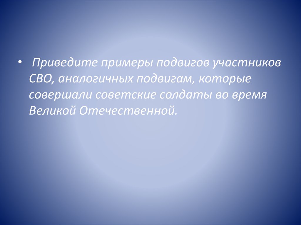 • Приведите примеры подвигов участниковСВО, аналогичных подвигам, которые