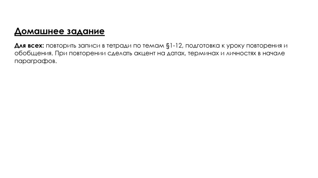 обобщения. При повторении сделать акцент на датах, терминах и личностях в начале