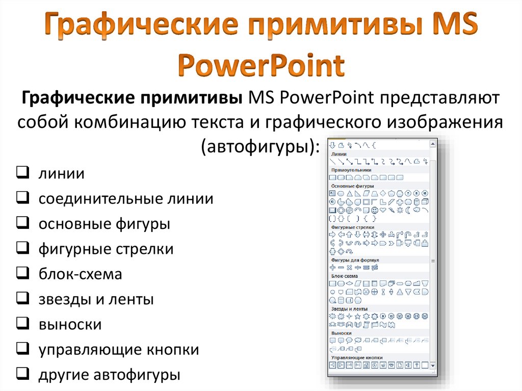 Графические примитивы MS PowerPoint представляютсобой комбинацию текста и графического изображения