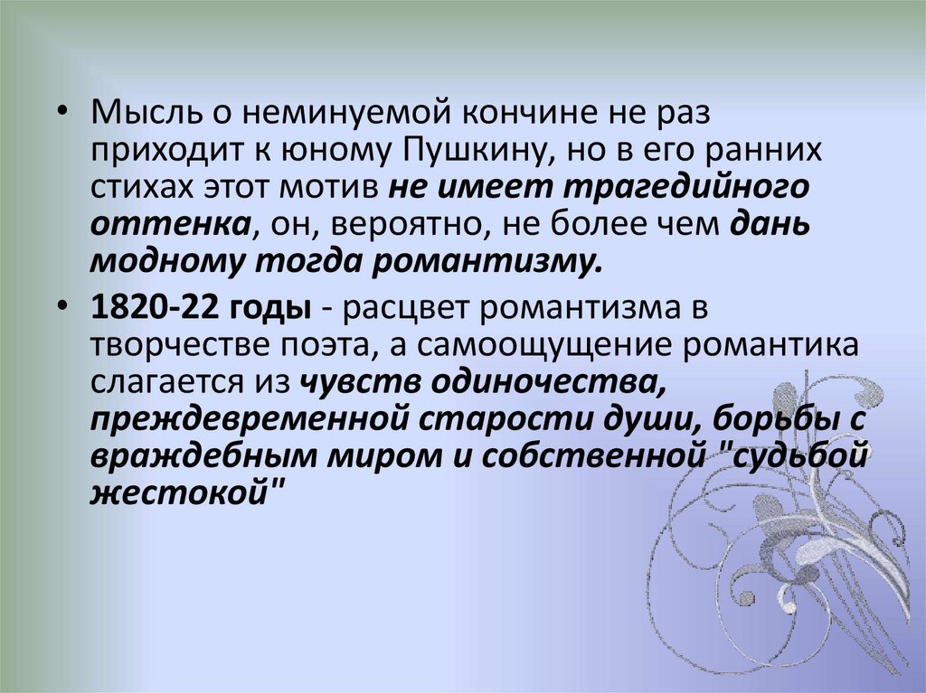 • Уже в раннем творчестве начинает звучатьтема смерти ("Моя эпитафия", "Завещание",