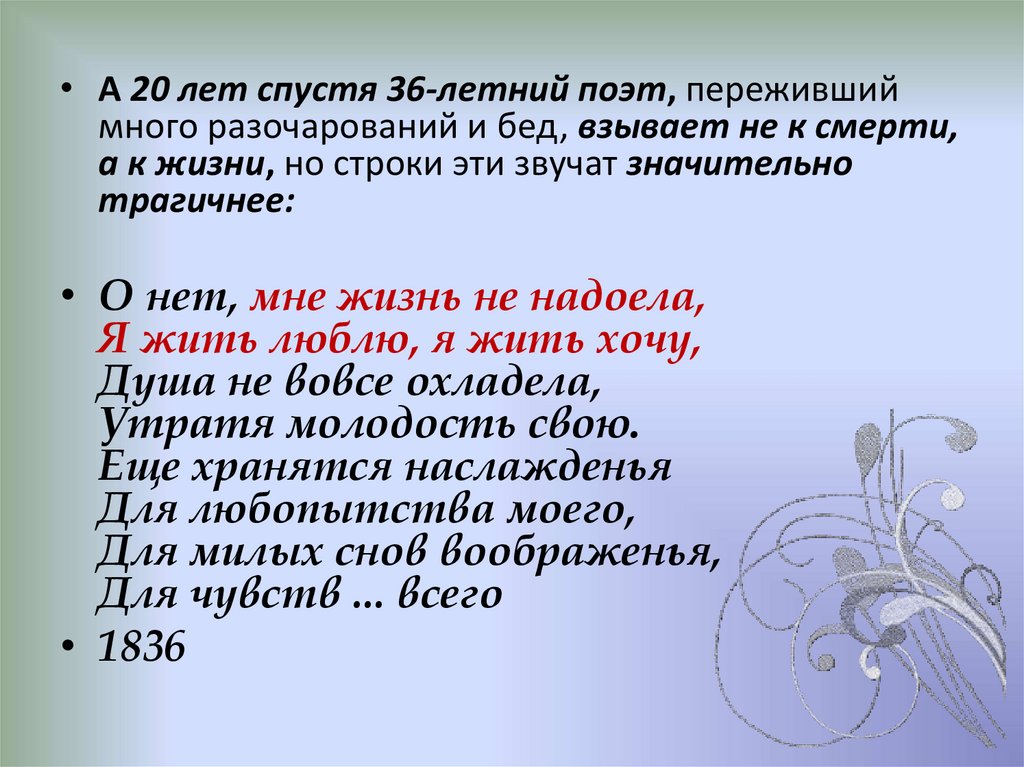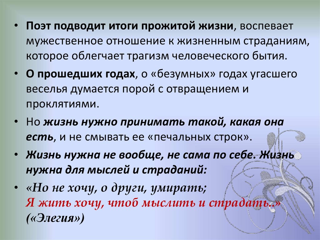 • Поэт подводит итоги прожитой жизни, воспеваетмужественное отношение к жизненным страданиям,