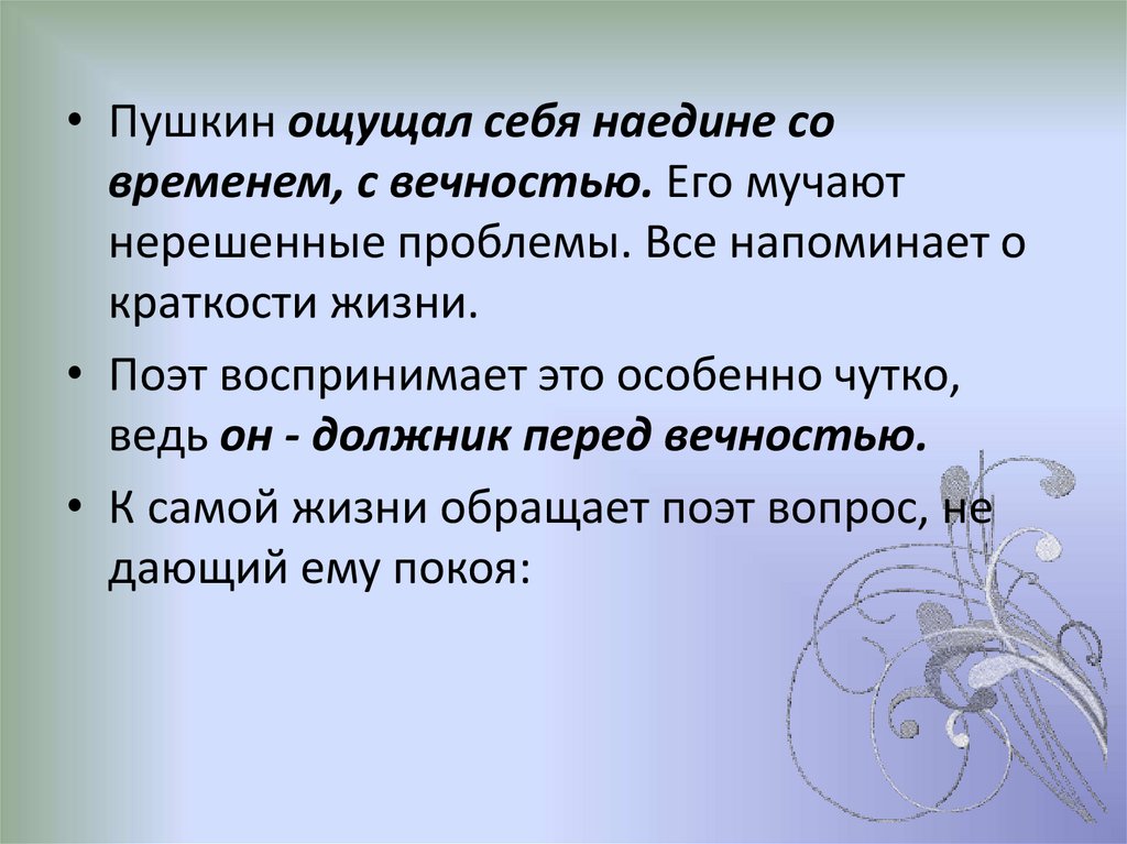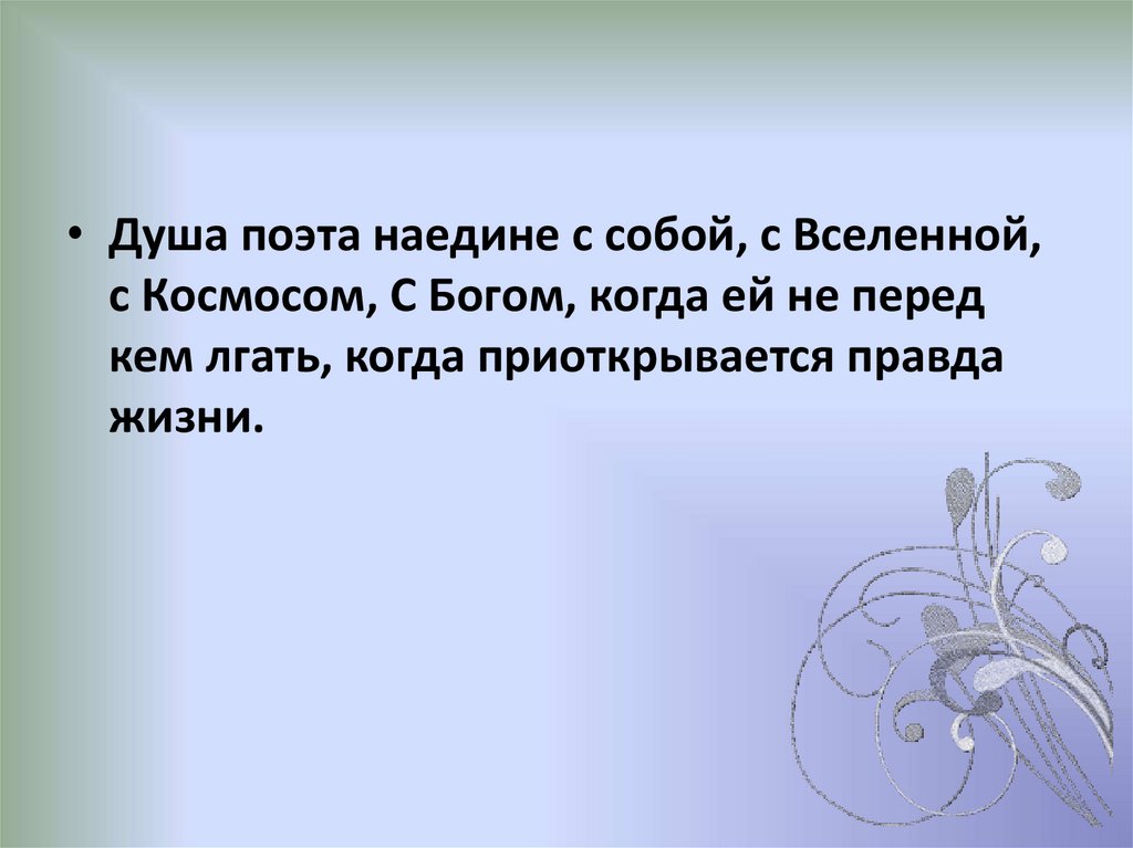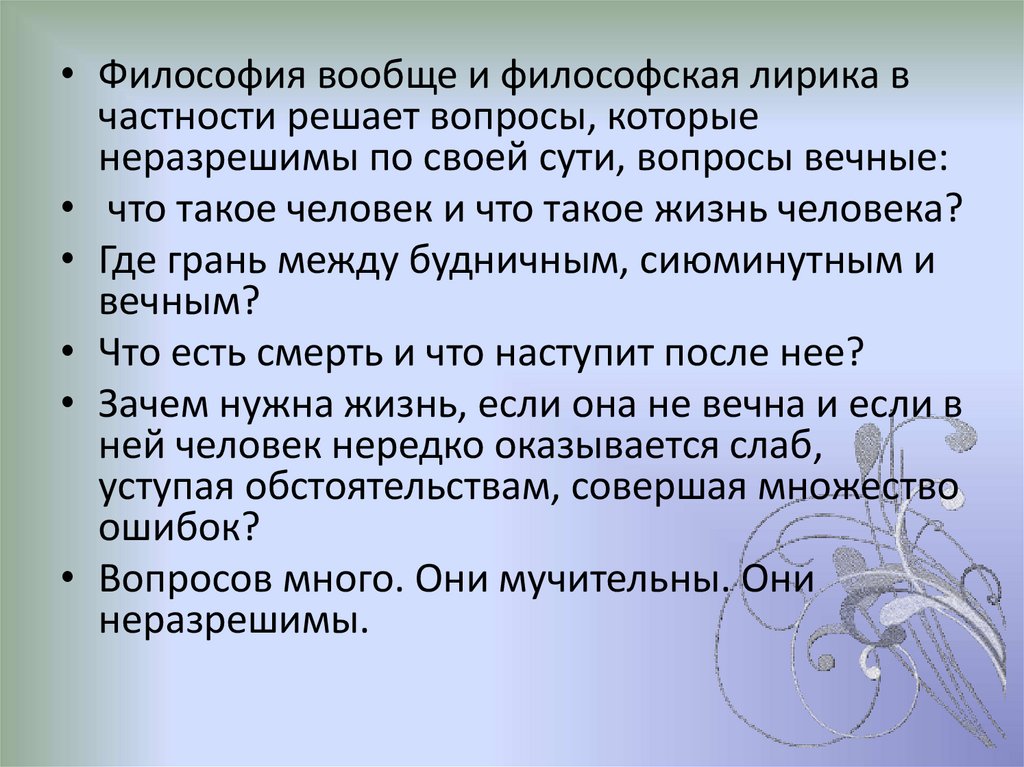 • Философия вообще и философская лирика вчастности решает вопросы, которые