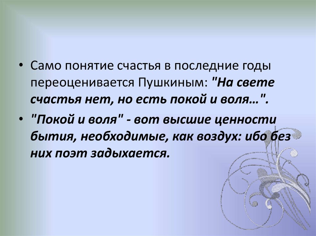 • Само понятие счастья в последние годыпереоценивается Пушкиным: "На свете