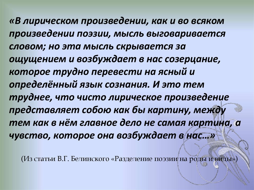 (Из статьи В.Г. Белинского «Разделение поэзии на роды и виды»)