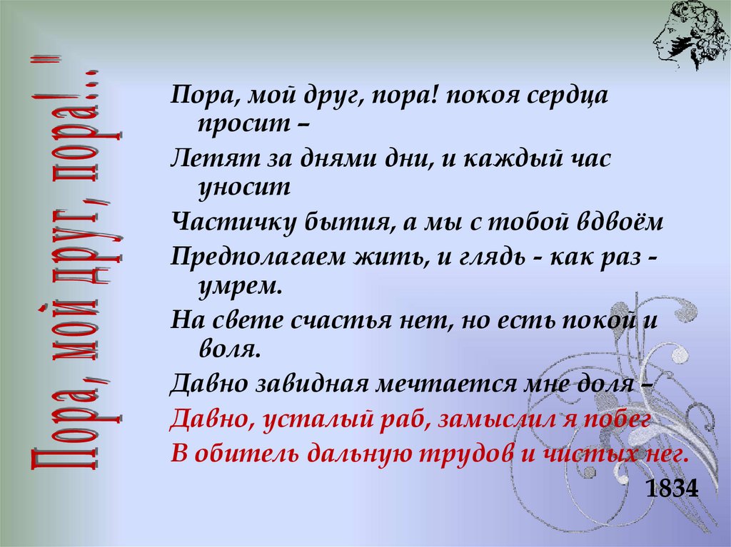 Пора, мой друг, пора! покоя сердцапросит –