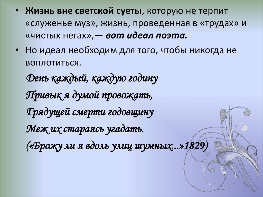 • Жизнь вне светской суеты, которую не терпит«служенье муз», жизнь, проведенная в «трудах» и