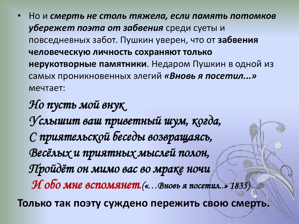 • Но и смерть не столь тяжела, если память потомковубережет поэта от забвения среди суеты и