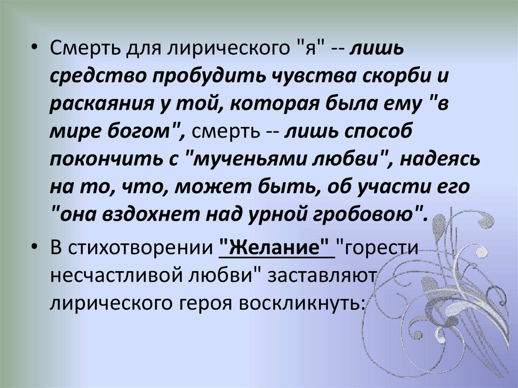 • Смерть для лирического "я" -- лишьсредство пробудить чувства скорби и
