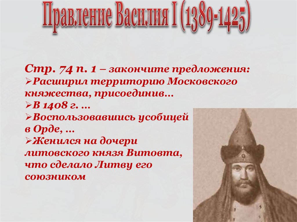 Стр. 74 п. 1 – закончите предложения:Расширил территорию Московского