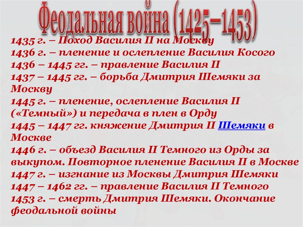 1435 г. – Поход Василия II на Москву1436 г. – пленение и ослепление Василия Косого