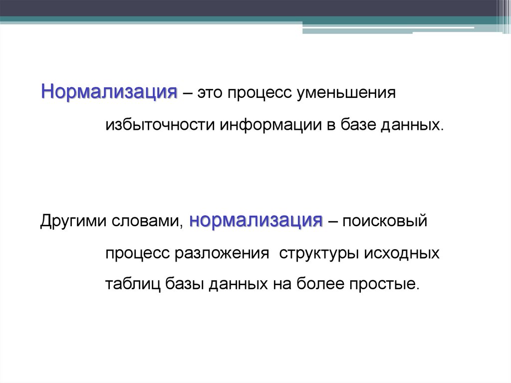 Нормализация – это процесс уменьшенияизбыточности информации в базе данных.