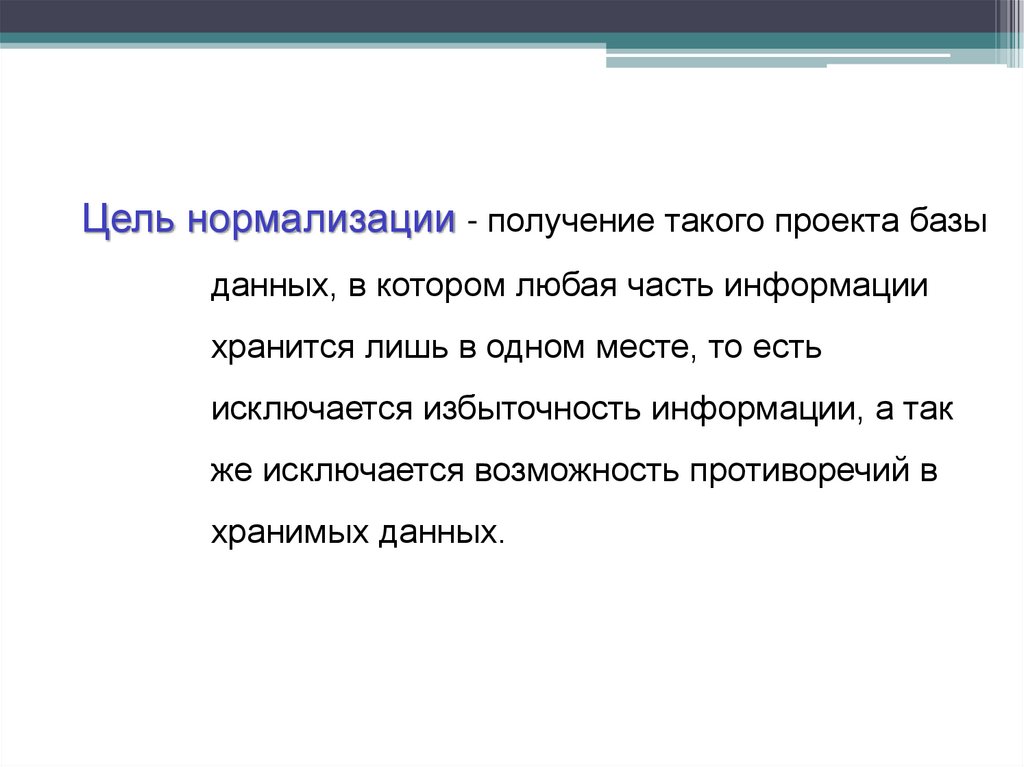 Цель нормализации - получение такого проекта базыданных, в котором любая часть информации