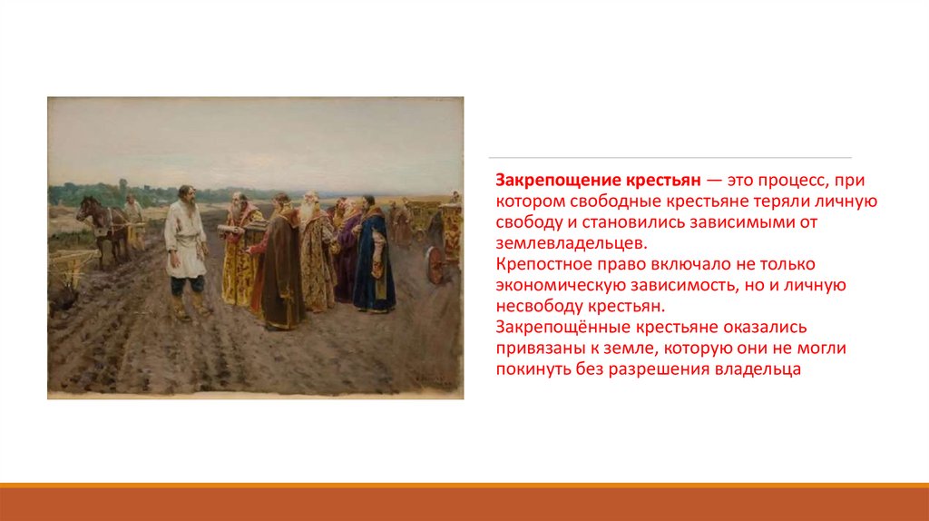 Закрепощение крестьян — это процесс, прикотором свободные крестьяне теряли личную