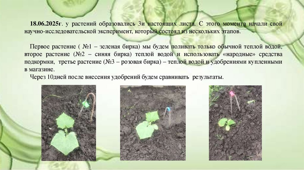 18.06.2025г. у растений образовались 3и настоящих листа. С этого момента начали свойнаучно-исследовательской эксперимент, который состоял из нескольких этапов.
