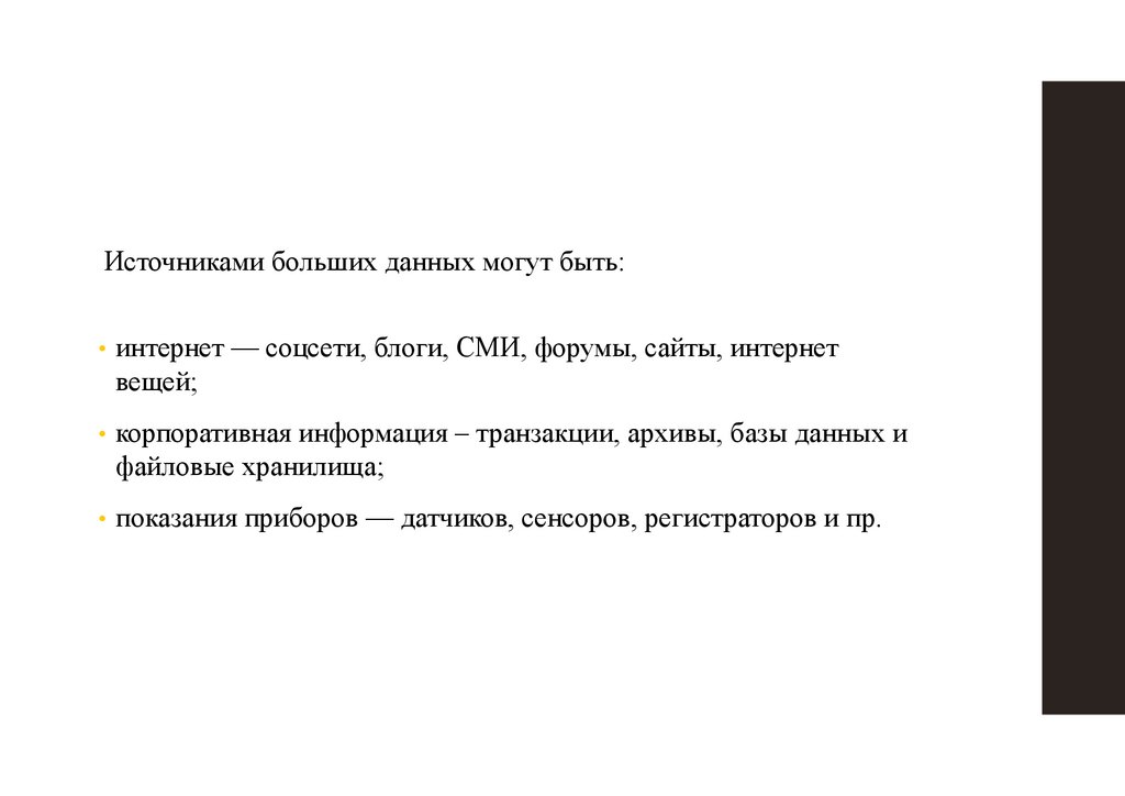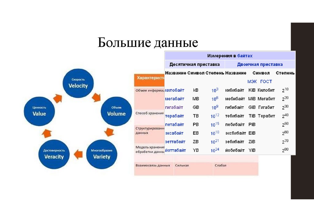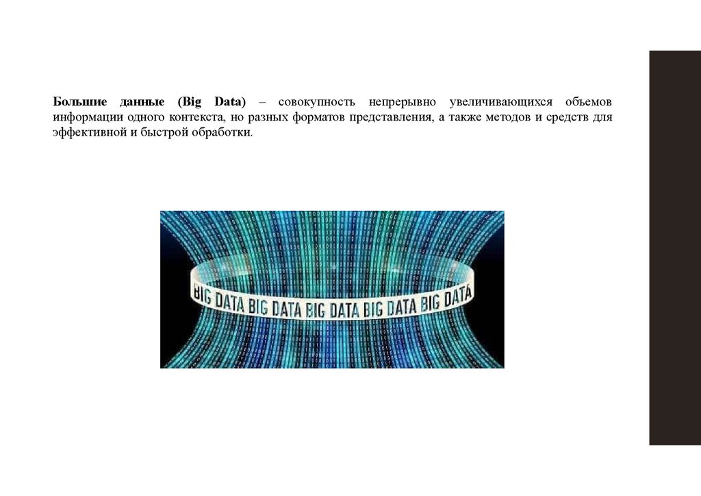 Большие данные (Big Data) – совокупность непрерывно увеличивающихся объемовинформации одного контекста, но разных форматов представления, а также методов и средств для