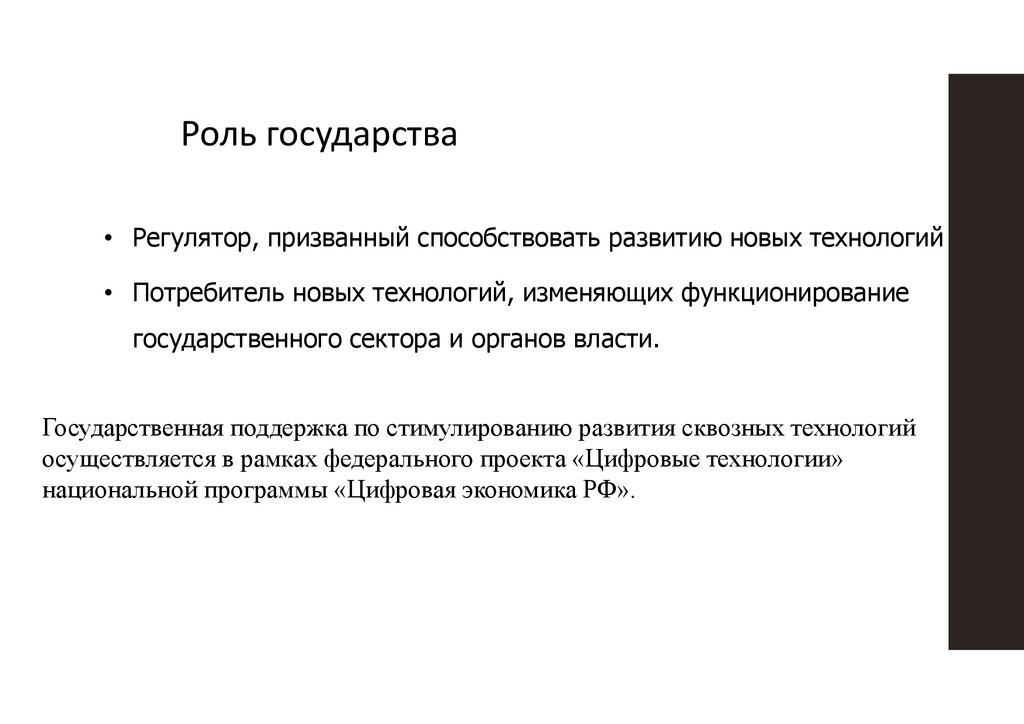 Роль государства• Регулятор, призванный способствовать развитию новых технологий