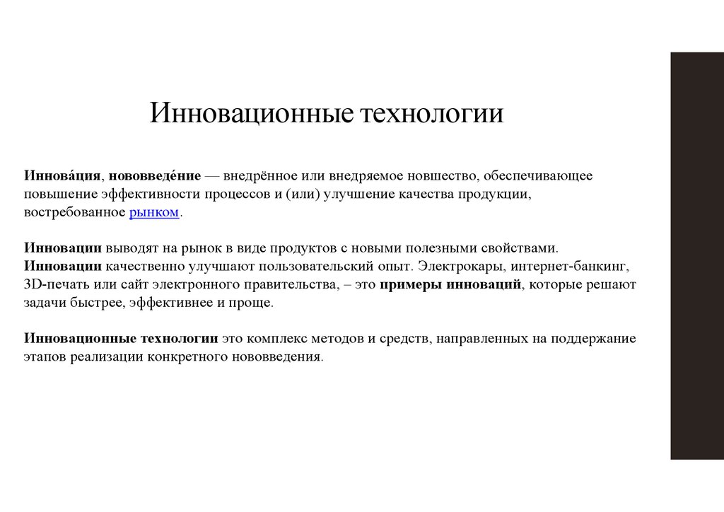 Инновационные технологииИннова́ция, нововведе́ние — внедрённое или внедряемое новшество, обеспечивающее