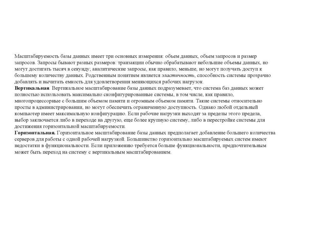 Масштабируемость базы данных имеет три основных измерения: объем данных, объем запросов и размерзапросов. Запросы бывают разных размеров: транзакции обычно обрабатывают небольшие объемы данных, но