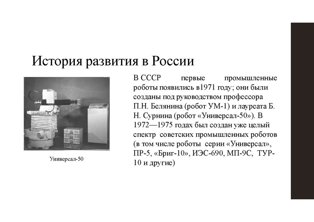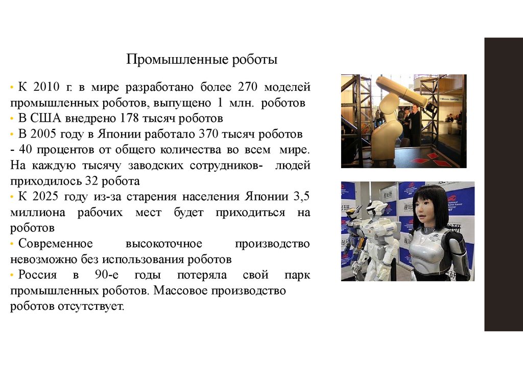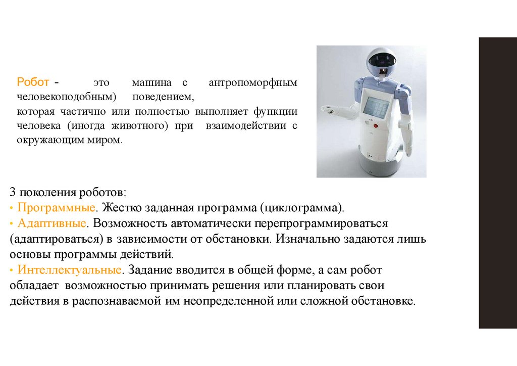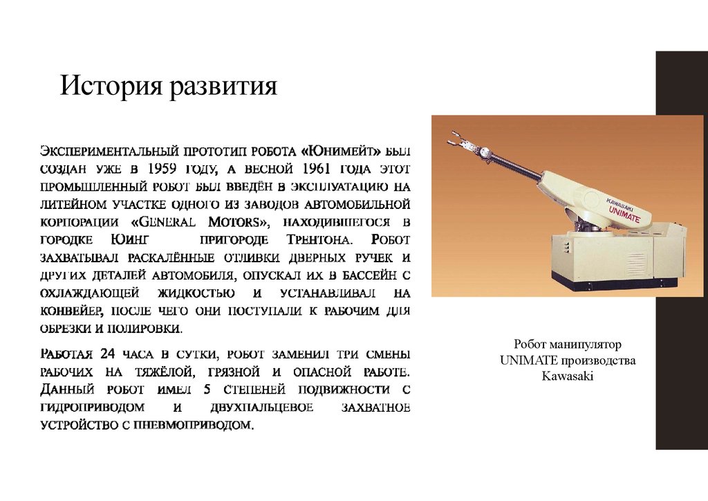 Манипуляционные роботы• Эти роботы отличаются от роботов первого поколения существенно большим ассортиментом
