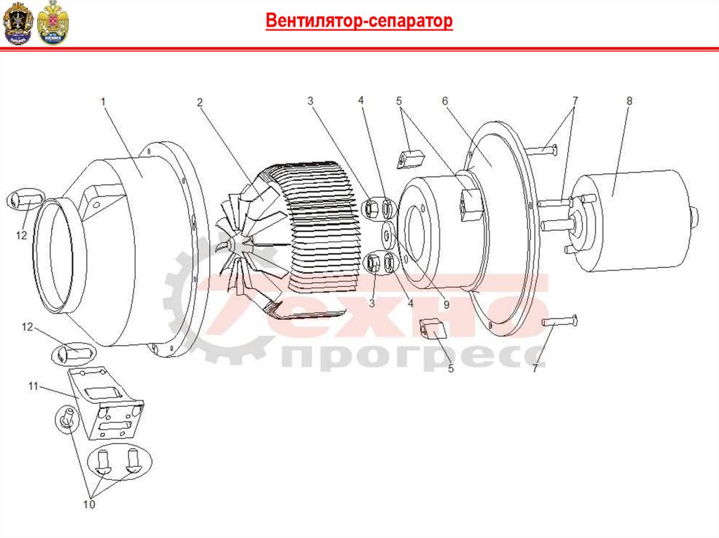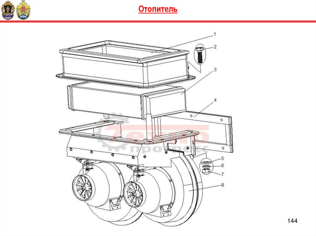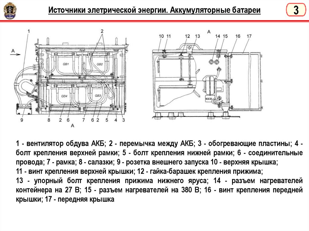 1 - вентилятор обдува АКБ; 2 - перемычка между АКБ; 3 - обогревающие пластины; 4 болт крепления верхней рамки; 5 - болт крепления нижней рамки; 6 - соединительные