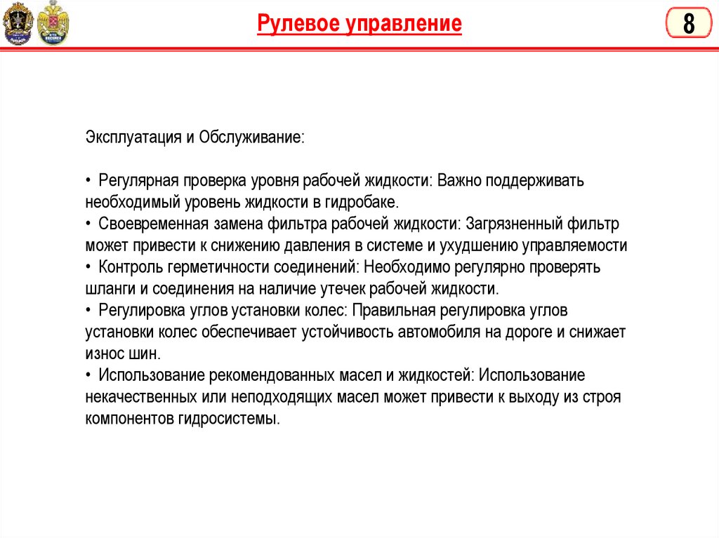 Рулевое управлениеЭксплуатация и Обслуживание: