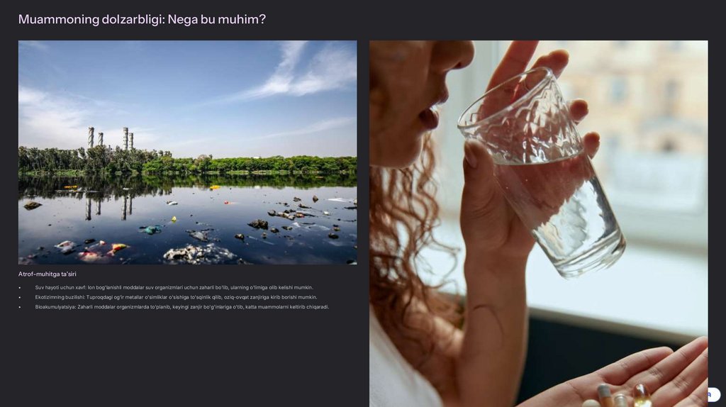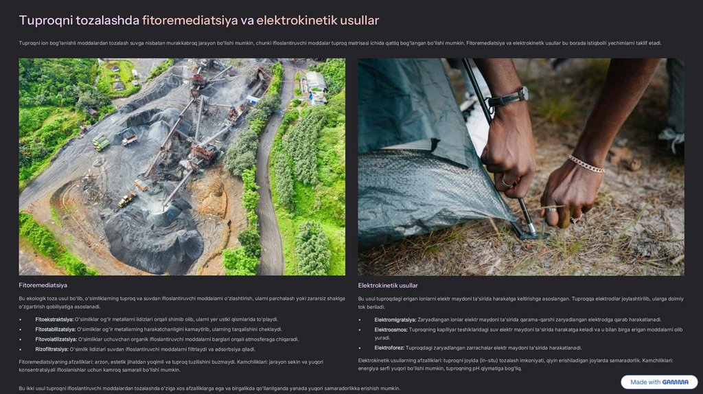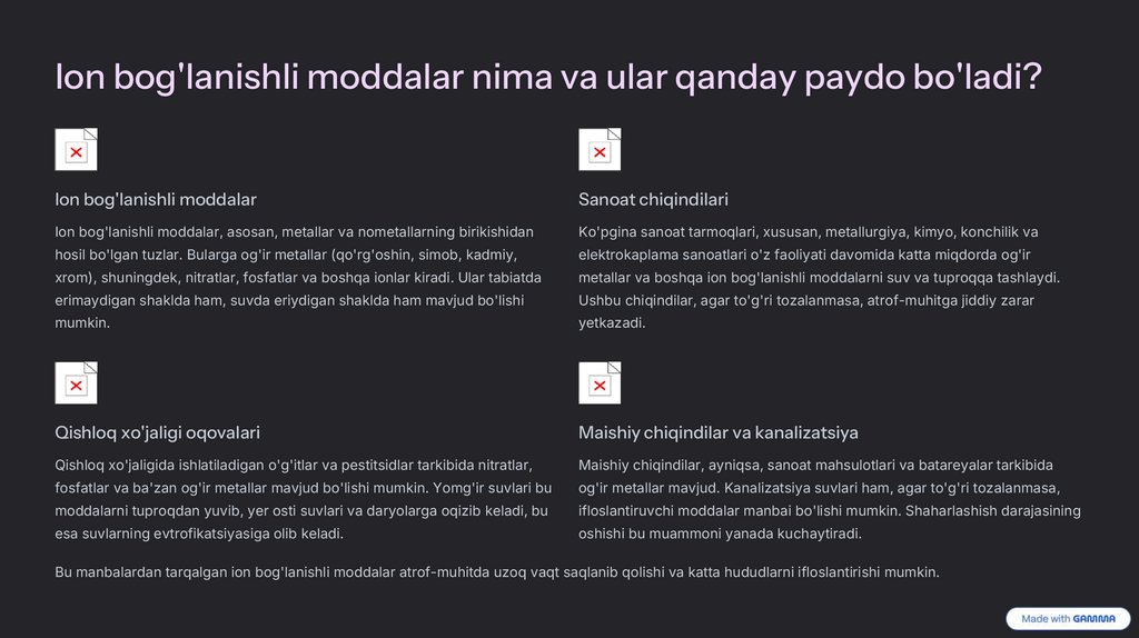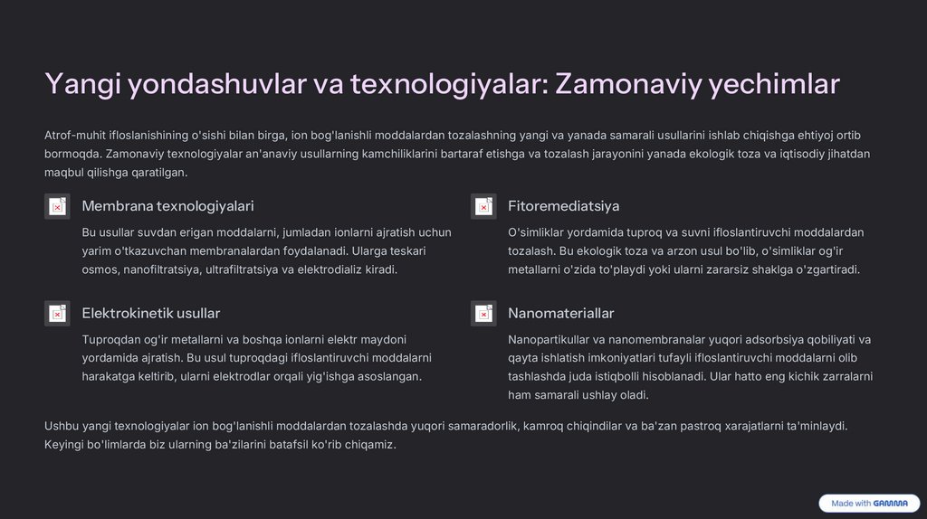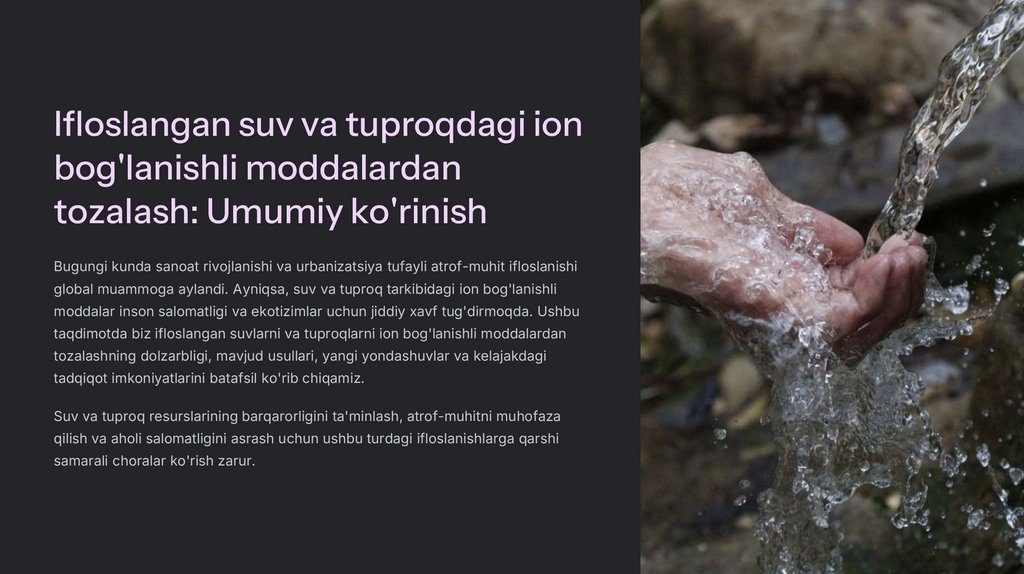 taqdimotda biz ifloslangan suvlarni va tuproqlarni ion bog'lanishli moddalardan