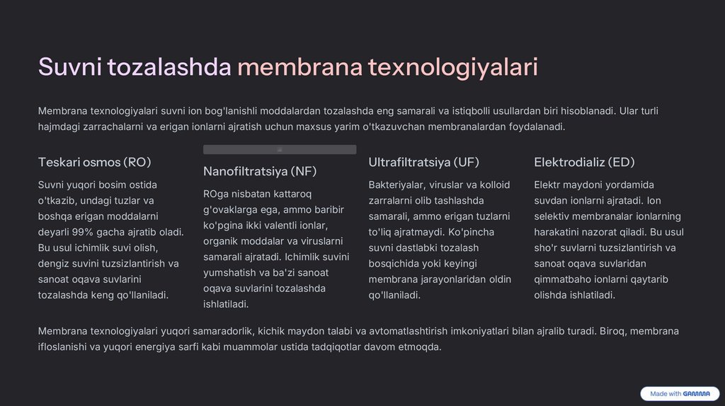 Suvni tozalashda membrana texnologiyalariMembrana texnologiyalari suvni ion bog'lanishli moddalardan tozalashda eng samarali va istiqbolli usullardan biri hisoblanadi. Ular turli