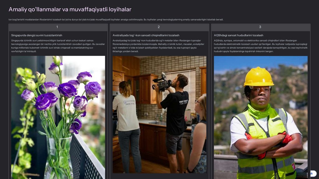 Amaliy qo'llanmalar va muvaffaqiyatli loyihalarIon bog'lanishli moddalardan ifloslanishni tozalash bo'yicha dunyo bo'ylab ko'plab muvaffaqiyatli loyihalar amalga oshirilmoqda. Bu loyihalar yangi texnologiyalarning amaliy samaradorligini isbotlab beradi.