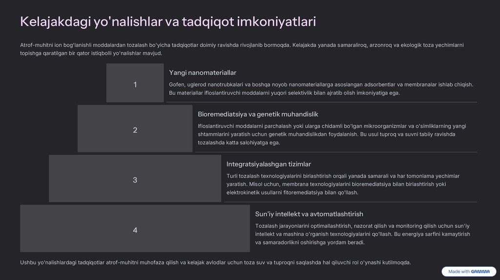 Kelajakdagi yo'nalishlar va tadqiqot imkoniyatlariAtrof-muhitni ion bog'lanishli moddalardan tozalash bo'yicha tadqiqotlar doimiy ravishda rivojlanib bormoqda. Kelajakda yanada samaraliroq, arzonroq va ekologik toza yechimlarni