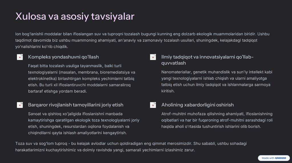 Xulosa va asosiy tavsiyalarIon bog'lanishli moddalar bilan ifloslangan suv va tuproqni tozalash bugungi kunning eng dolzarb ekologik muammolaridan biridir. Ushbu