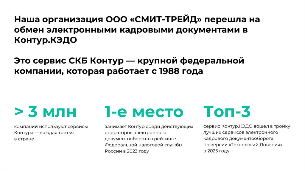 1. Наша организация ООО «СМИТ-ТРЕЙД» перешла на обмен электронными кадровыми документами в Контур.КЭДО Это сервис СКБ Контур —