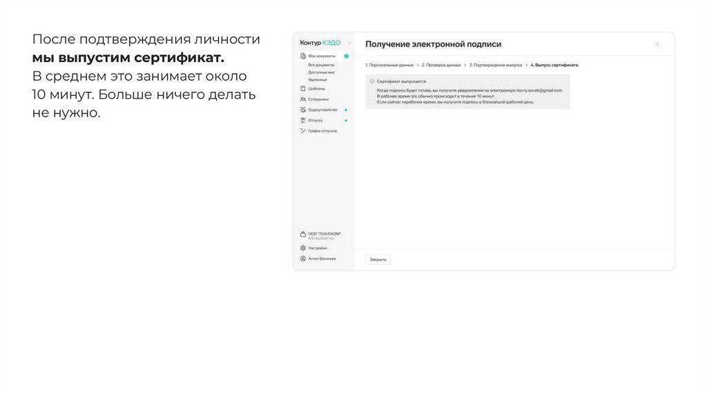 После подтверждения личностимы выпустим сертификат.