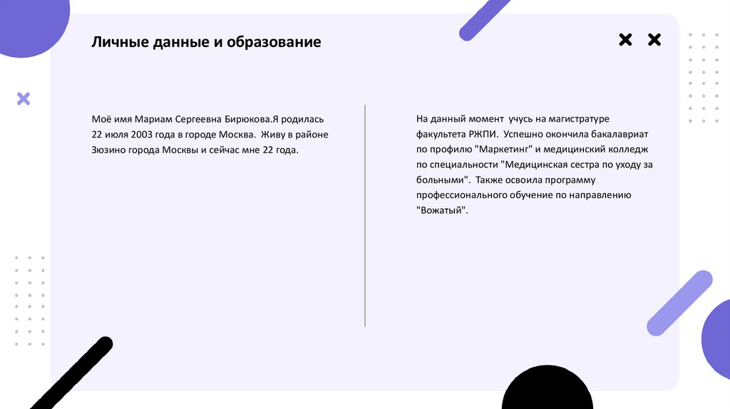 Личные данные и образованиеМоё имя Мариам Сергеевна Бирюкова.Я родилась