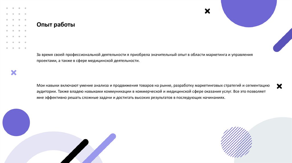 Опыт работыЗа время своей профессиональной деятельности я приобрела значительный опыт в области маркетинга и управления