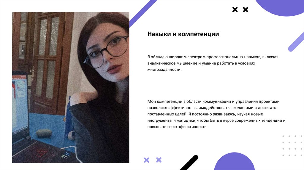 Навыки и компетенцииЯ обладаю широким спектром профессиональных навыков, включая