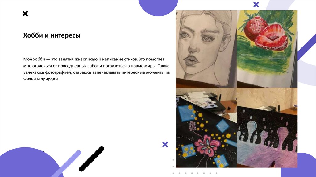 Хобби и интересыМоё хобби — это занятия живописью и написание стихов.Это помогает