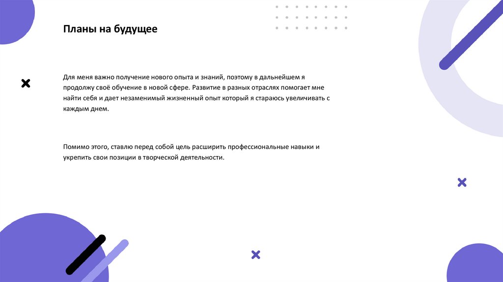 Планы на будущееДля меня важно получение нового опыта и знаний, поэтому в дальнейшем я