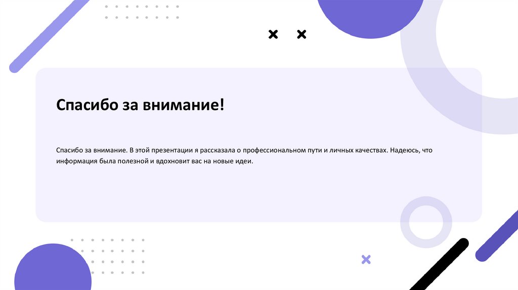 Спасибо за внимание!Спасибо за внимание. В этой презентации я рассказала о профессиональном пути и личных качествах. Надеюсь, что