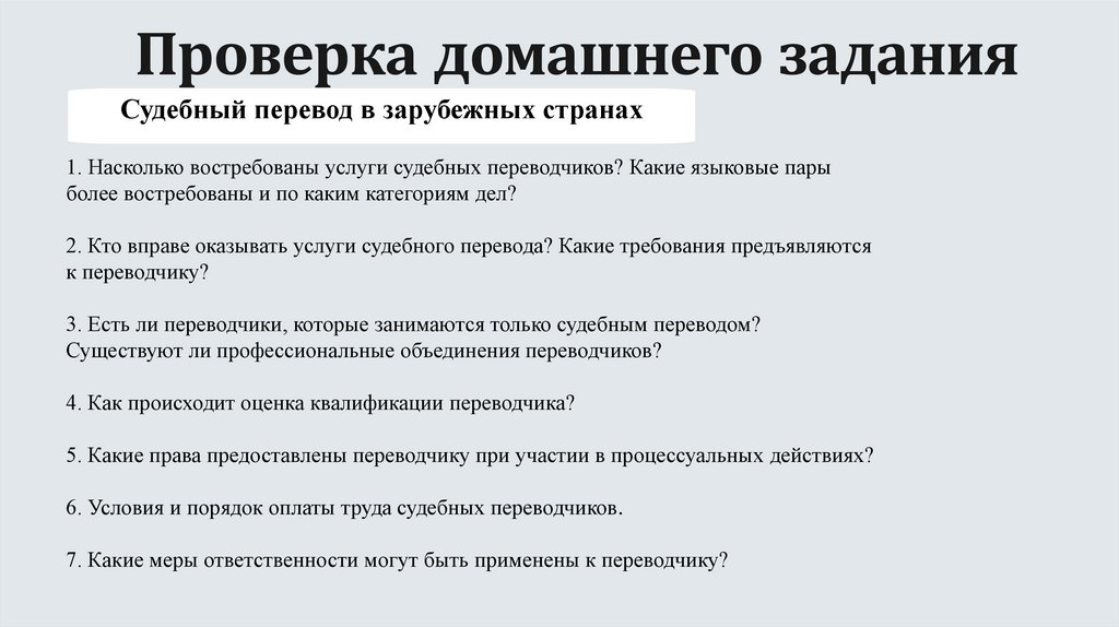 Проверка домашнего заданияСудебный перевод в зарубежных странах