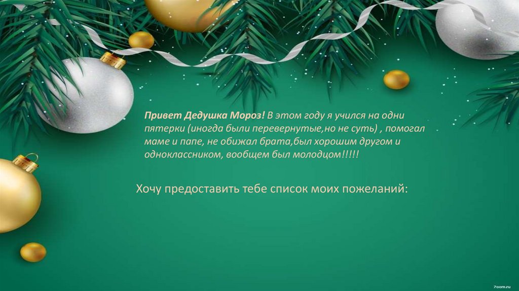 Привет Дедушка Мороз! В этом году я учился на однипятерки (иногда были перевернутые,но не суть) , помогал