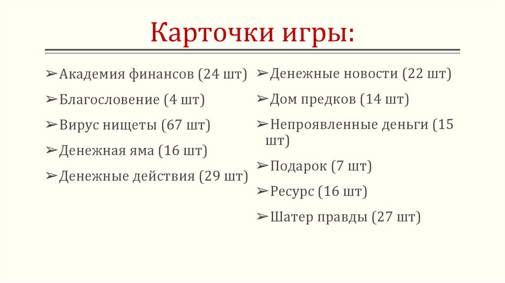 Карточки игры:➢Академия финансов (24 шт) ➢Денежные новости (22 шт)