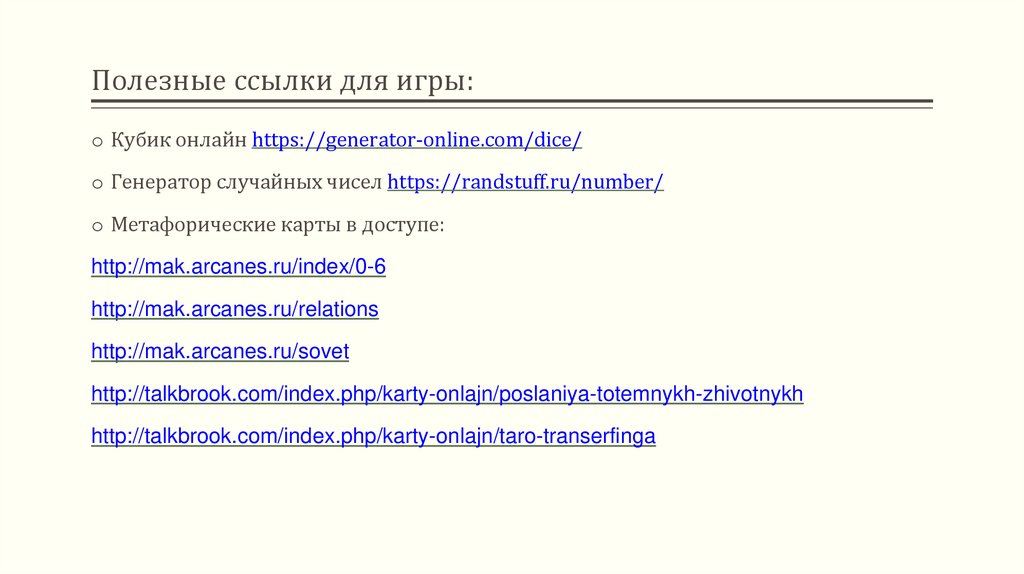 Полезные ссылки для игры:o Кубик онлайн https://generator-online.com/dice/