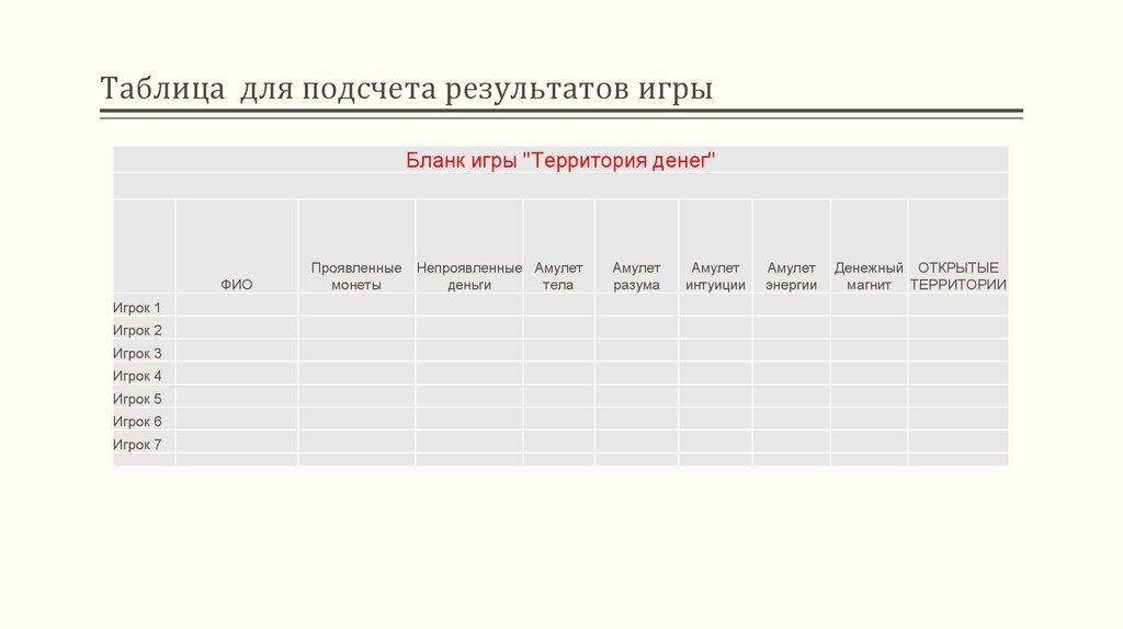 Таблица для подсчета результатов игрыБланк игры "Территория денег"
