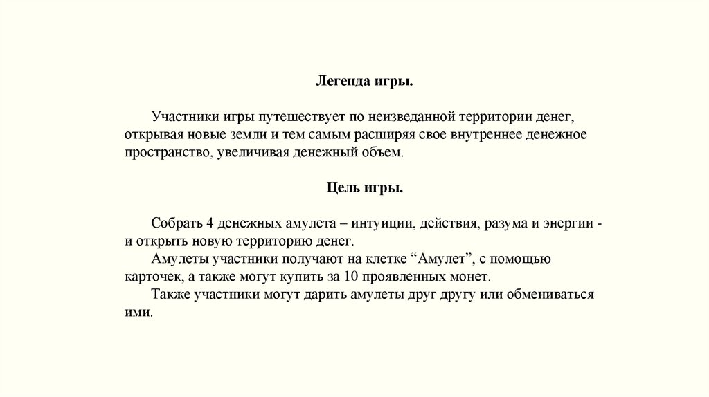 Легенда игры.Участники игры путешествует по неизведанной территории денег,