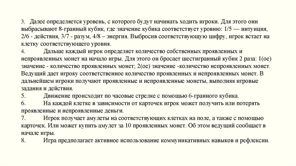 3. Далее определяется уровень, с которого будут начинать ходить игроки. Для этого онивыбрасывают 8-гранный кубик, где значение кубика соответствует уровню: 1/5 — интуиция,