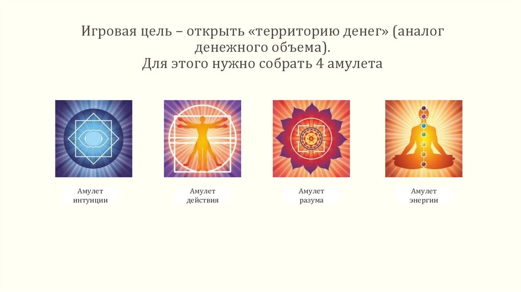 Собрать 4 денежных амулета – интуиции, действия, разума и энергии и открыть новую территорию денег.